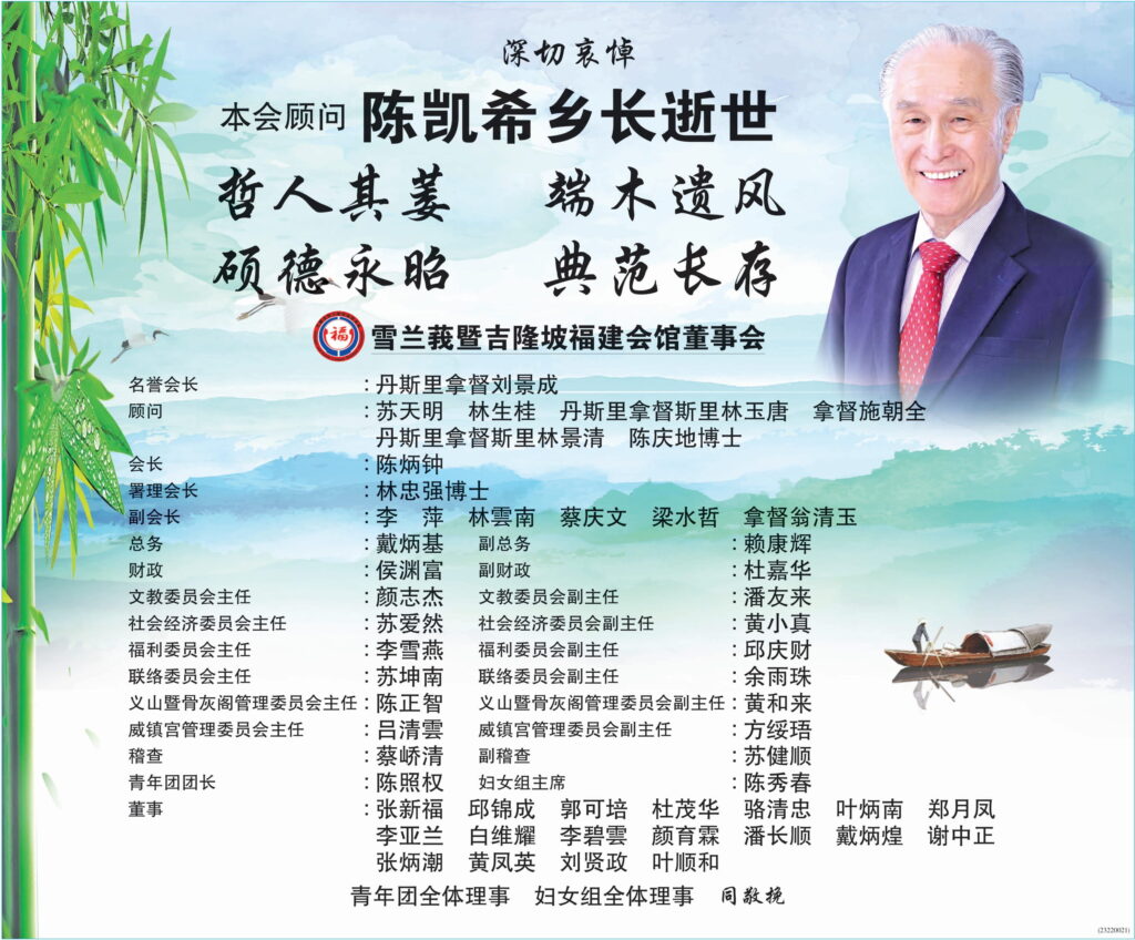 雪隆福建会馆三机构 深切哀悼 本会顾问陈凯希乡长逝世。有关挽词刊登于2022年2月24日《南洋商报》。