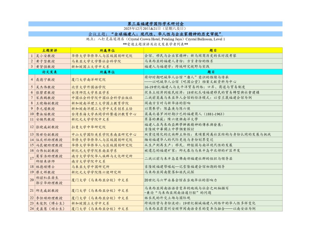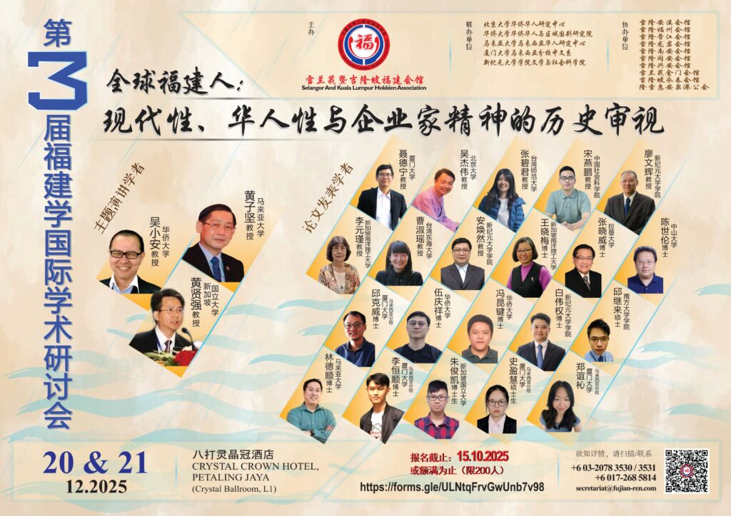 📣 为深入发掘与传承全球福建人的丰厚历史文化遗产,为华族研究谱写崭新篇章💎,适逢雪隆福建会馆成立140周年,我会将于2025年12月20日(星期六)至21日(星期日),隆重举办为期两天的“第三届福建学国际学术研讨会”。