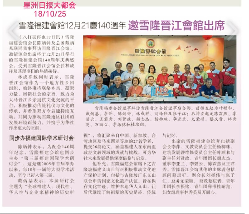 📌雪隆福建会馆会长陈炳钟及总务戴炳基联同一众董事于近日拜访雪隆晋江会馆,邀请该会出席将于2025年12月21日举行的雪隆福建会馆140周年庆典盛会,受到雪隆晋江会馆会长林成祥及其理事们的热情接待。双方就闽属乡团未来的发展、文化教育的传承及合作方向展开深入交流,气氛融洽热烈。