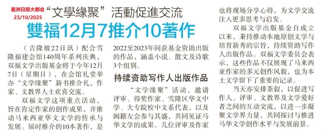 配合雪隆福建会馆140周年系列庆典,双福文学出版基金将于 12月7日(星期日)下午2时,在雪隆福建会馆礼堂举办📚 《文学缘聚》新书推介礼!