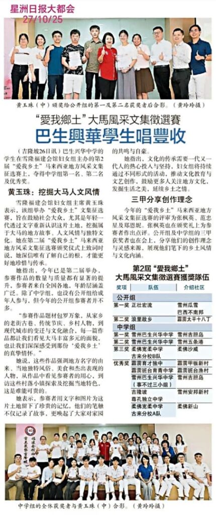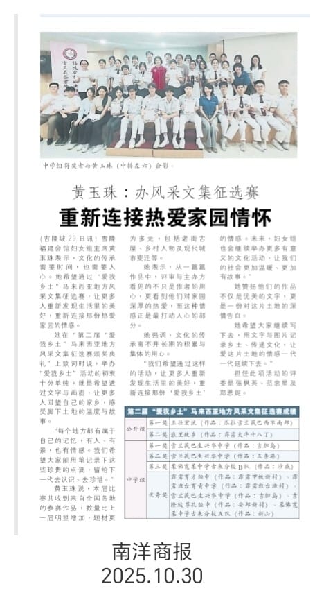 雪隆福建会馆妇女组主办的第二届《爱我乡土》马来西亚地方风采文集征选赛颁奖仪式圆满结束。雪兰莪巴生兴华中学夺得中学组第一名、第二名及优秀奖。