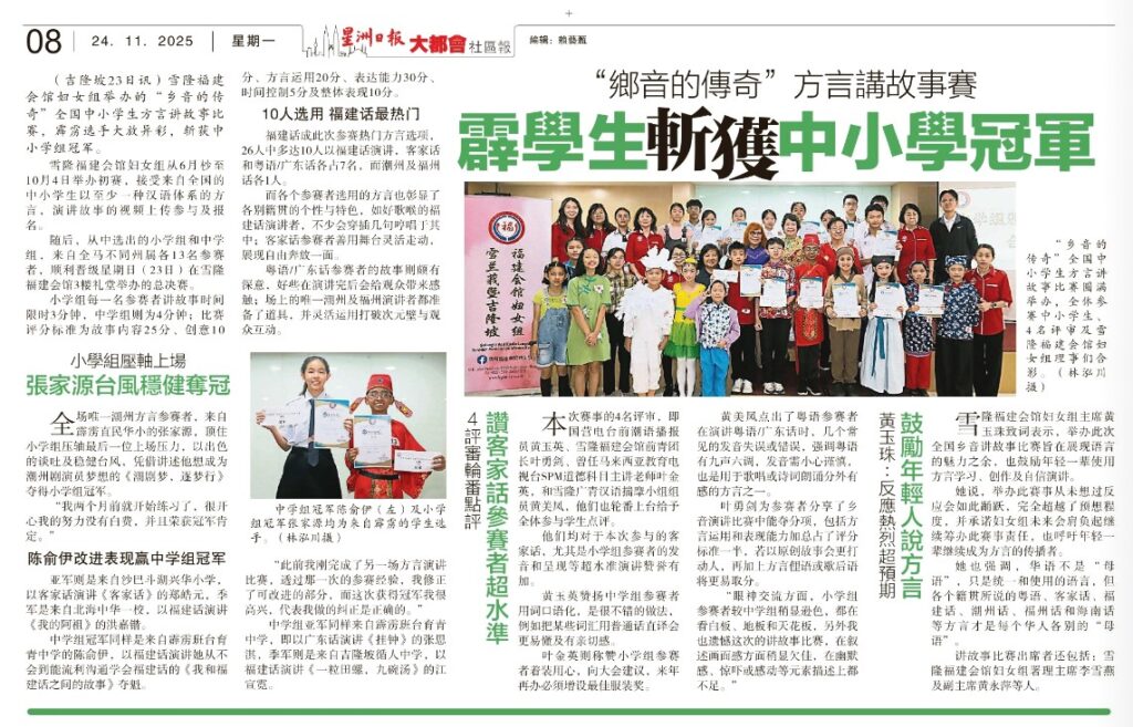 🎉 雪隆福建会馆妇女组主办的首届 “乡音的传奇”全国中小学生方言讲故事比赛_总决赛于日前在热烈与温馨的气氛中圆满举行。来自全马各地的中小学生齐聚舞台,以各自的乡音讲述故事、传递情感、延续文化,为现场观众呈现了一场充满文化韵味与青春活力的精彩盛宴。