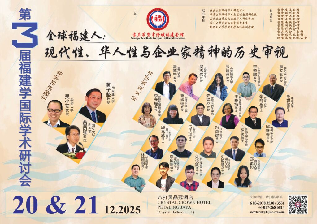 📢经10年后,今年2025年适逢雪隆福建会馆成立140周年,本会毅然决定举办“第三届福建学国际学术研讨会”,于2025年12月20日(星期六/早上8点至下午6点)至21日(星期日/早上8点至下午2点)为期两天假八打灵晶冠酒店(Crystal Crown Hotel Petaling Jaya)隆重举行。“第三届福建学国际学术研讨会”的大会主题为:“全球福建人:现代性、华人性与企业家精神的历史审视”,将研究范围扩大至全球福建人领域,以期更深、更广地发掘和追溯全球福建人的丰富历史遗产,为全球华族历史研究谱写崭新篇章。