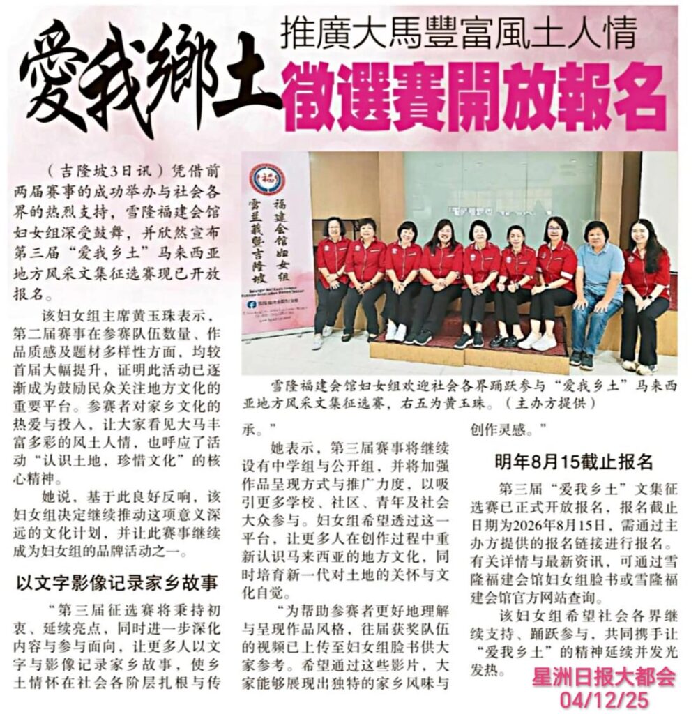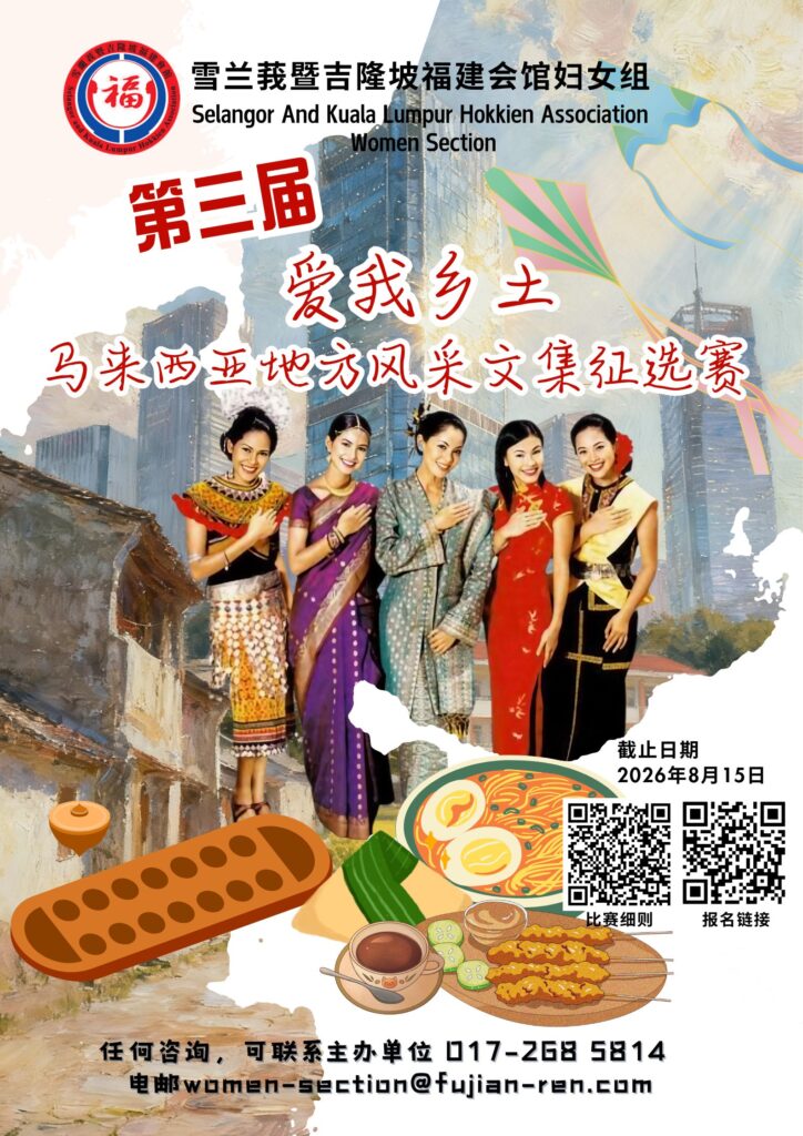 雪隆福建会馆妇女组诚挚邀请各中学生及公众人士参与第三届“爱我乡土”文集征选赛,通过文字、影像与口述视频记录家乡故事,展现马来西亚丰富的地方文化与风土人情!