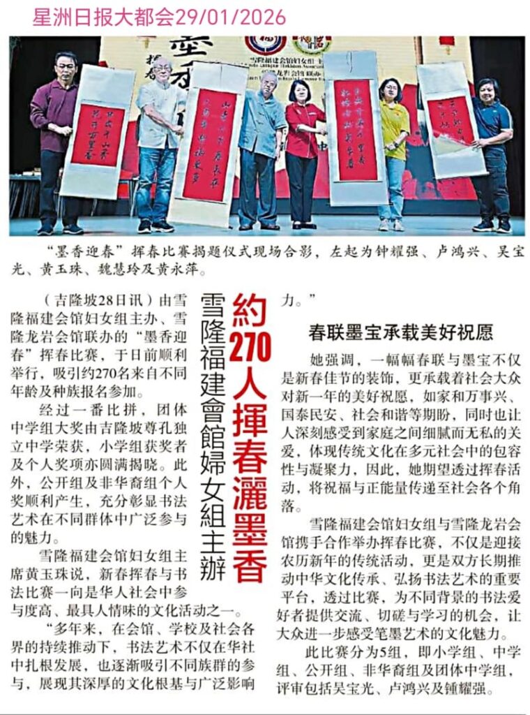 🖌️ 由雪隆福建会馆妇女组主办、雪隆龙岩会馆联办的「墨香迎春」挥春比赛,于1月25日在温馨热闹的氛围中顺利举行。活动吸引约270人报名参加,参赛者包括来自各校的中、小学生及书法爱好者,当中亦有非华裔人士踊跃参与,展现中华书法艺术跨族群交流的文化魅力,现场洋溢着浓厚的新春文化气息。