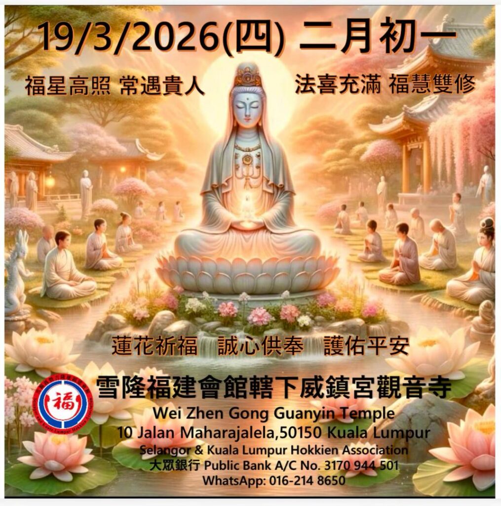 🙏为弘扬佛法、广结善缘,威镇宫观音寺将于2026年3月19日(星期四),农历二月初一,在上午10时30分至11时30分举行诵经礼佛。届时将由法师带领善信一同诵经礼佛,祈愿大众身心安稳、福慧增长。