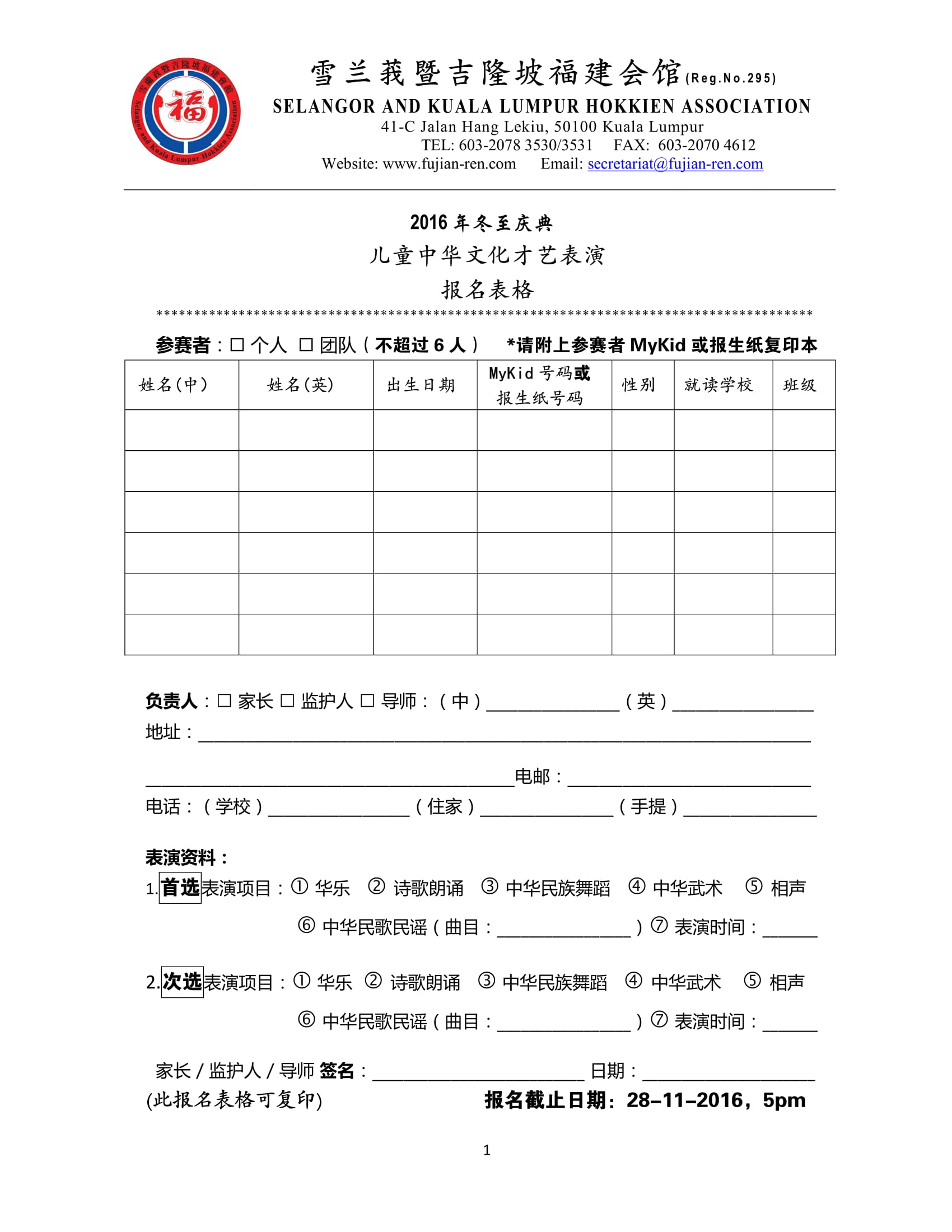 ** 报名表格可从 www.fujian-ren.com或Facebook:Hokkien Lang下载或向秘书处索取。